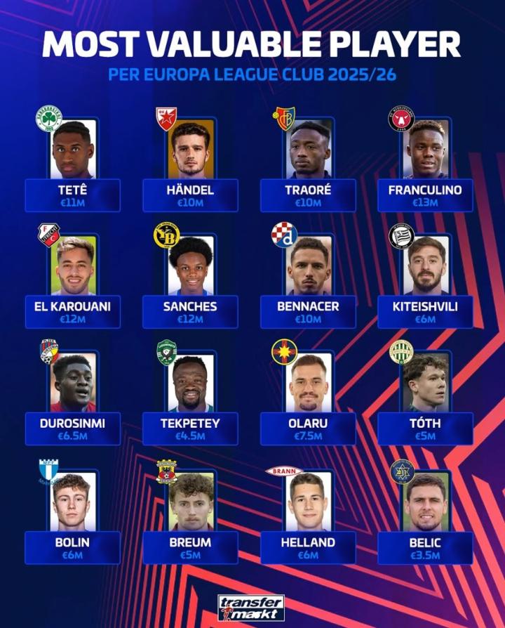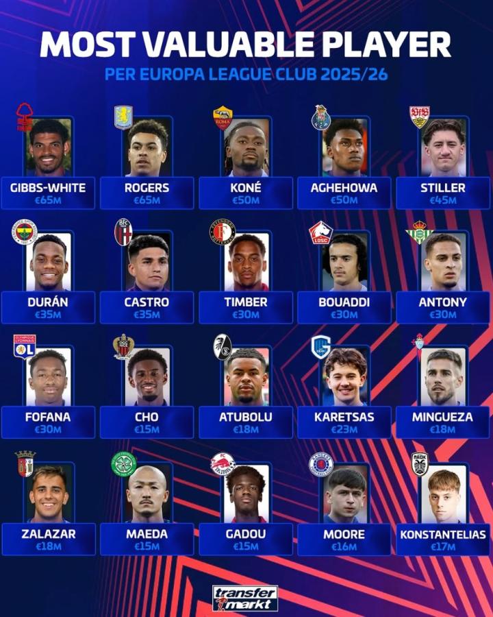 本赛季欧联杯各队身价最高球员,星光熠熠: